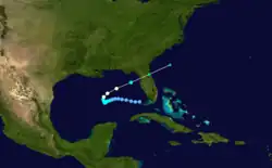 A low-pressure area centered the Gulf of Mexico on September 25 and was designated as a tropical depression hours later.[8] Turning west-southwestward, the storm gradually intensified, attaining tropical storm-status on September 27. The next day, the system nearly stalled close to the center of the Gulf of Mexico.[4] On September 28, further development of the storm took place and ships in the vicinity of the storm reported a strong gale.[8] The next day, the storm strengthened into a hurricane.[4] Several hours later, nearby ship reported a pressure of 987 mbar (29.1 inHg), the lowest pressure associated with the hurricane.[13] Around this time, the storm reached its peak intensity with winds of 85 mph (137 km/h); the storm also began to turn northeastward at this time. The hurricane then accelerated and began weakening. Early on September 30, the storm made landfall near Cedar Key, Florida, with winds up to 65 mph (105 km/h) before transitioning into an extratropical cyclone over Florida. Later that day, the remnants dissipated over the eastern Atlantic Ocean.[4]