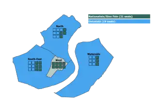 The Local Government (Ireland) Act 1919 had seen the introduction of a PR electoral system for local government elections in Ireland. Turnout was high, at 93.5%. Despite the new electoral system only 2.8% of ballots were spoiled.[2] Whilst Unionists won nearly 60% of the popular vote, this was connected to the Nationalist dominated West Ward going uncontested.