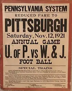 - ^ "W. And J. Surprises Panthers, 7 to 0". The New York Times. November 13, 1921. p. Sect 8-2 – via Newspapers.com.
