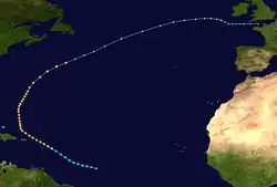 A northeast-southwest oriented trough developed into a tropical depression about 870 mi (1,400 km) east-southeast of Barbados early on September 13.[3] Initially moving west-northwestward, the depression intensified into a tropical storm several hours later, before curving northwestward the next day.[6] The French S. S. Mont Rose was the first ship to encounter the storm, then centered about 200 mi (320 km) east of Martinique on September 15.[3] Thereafter, the cyclone strengthened significantly, becoming a hurricane around 12:00 UTC and then reaching major hurricane intensity by 06:00 UTC on September 16.[6] The cyclone strengthened slightly over the next few days, with sustained winds peaking at 120 mph (190 km/h) on September 17. By later that day, the system curved northward while centered north of the Mona Passage. Early on September 20, the hurricane began moving north-northeastward.[6] Around 12:00 UTC on September 21, the hurricane passed almost directly over Bermuda while still at major hurricane intensity.[6] The storm began accelerating and weakening later on September 21. By 00:00 UTC on September 23, the system became extratropical about 510 mi (820 km) south of Cape Race, Newfoundland. The remnants slowly weakened while approaching the British Isles, before dissipating over the English Channel on September 28.[6]