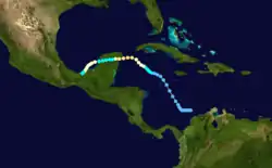 The hurricane weakened slightly prior to making landfall near Playa del Carmen, Quintana Roo, with winds of 100 mph (160 km/h) around 12:00 UTC on October 18. Crossing the Yucatán Peninsula, the cyclone weakened to a tropical storm by 00:00 UTC the next day. Early on October 20, the storm emerged into the Bay of Campeche and quickly re-strengthened into a hurricane. The system then drifted slowly south-southwestward. Shortly after 18:00 UTC on October 21, the hurricane made landfall near Paraíso, Tabasco, with winds of 80 mph (130 km/h). The storm rapidly weakened after moving inland and dissipated near Cárdenas by 06:00 UTC the next day.[6]