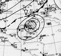 Historical weather maps suggest that a tropical depression developed about 85 mi (135 km) north-northwest of Barranquilla, Colombia, early on October 11. The depression moved slowly westward and then northwestward without significant intensification for a few days. By October 15, the depression had reached tropical storm status. Late on October 16, the cyclone began intensifying at a quicker pace, becoming the equivalent of a modern-day Category 2 hurricane on October 17. Around 00:00 UTC the next day, it peaked with maximum sustained winds of 110 mph (180 km/h).[6] Early on October 18, a ship reported a minimum pressure of 984 mbar (29.1 inHg) near the center, the lowest pressure measured during the life span of the storm.[3]