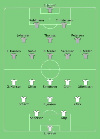 B 1909 fielded the same line-up, which had been used for the regional Funen Championship replay matches in early May 1927.[17][18] Fans of Horsens FS, who could no make the journey to Odense, were able to follow the course of the away match through the posting on telegram boards in the gate at the local newspaper, Horsens Avis.[19]