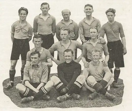 Winners of the Danish Provincial Football Championship 1927 — regular team line-up of Skovshoved IF. Standing: Ernst Hansen, Alex Guhle, Bernhard Møller, Ernst Sørensen, Sigurd Møller. Kneeling (middle): Johan Johansen, Helmuth Thomas, Willy Petersen. Sitting (front): Arthur Kuhlmann, Einar Jensen, Rasmus Christensen. Removed from the original un-edited photograf: Poul Hansen (reserve).[26][4][3]