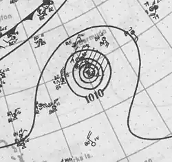![]() Surface weather analysis of the hurricane on August 5 | |