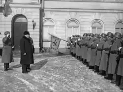 President Svinhufvud enters his office in Helsinki 2.3.1931. President Svinhufvud standing outside the Presidential Palace