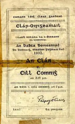 The 1932 All-Ireland Senior Hurling Championship Final was the 45th All-Ireland Final and the culmination of the 1932 All-Ireland Senior Hurling Championship, an inter-county hurling tournament for the top teams in Ireland. The match was held at Croke Park, Dublin, on 4 September 1932, between Kilkenny and Clare. The Munster champions lost to their Leinster opponents on a score line of 3–3 to 2–3.[1]