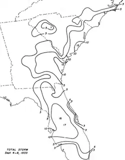 - Schoner, R. W.; Molansky, S. (July 1956). "Storms in the south Atlantic coastal region". Storm of September 4–8, 1933 (PDF) (Technical report). National Hurricane Research Project. Washington, D.C.: United States Weather Bureau. pp. 160–1. 3, Rainfall Associated with Hurricanes – via Weather Prediction Center.
