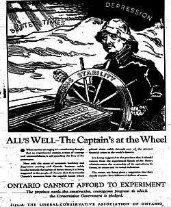 The campaign was brief and bitter, and both sides gained ammunition to use during that time.[2] The Liberals were helped by the effects of the Great Depression, in much the same manner as their colleagues in the recent elections in Nova Scotia, British Columbia and Saskatchewan.[a][2] They also aggressively pledged to reduce the cost of government once in office,[3] and downplayed the issue of temperance, by pledging to bring recently passed amendments to liquor legislation[4] into force as soon as they attained office.[5]