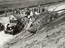The Fokker F.XXII PH-AJQ (named: "Kwikstaart") operated by KLM departed on 14 July 1935 at 9:37am local time for a scheduled international flight from Amsterdam via Hamburg, Copenhagen to Malmö. On board were twenty people: 15 passengers and 5 crew members.[1] There was also international mail on board, including British mail.[2] Shortly after take-off the left outer engine dropped in revolutions per minute and shortly afterwards also the left inner engine. Within a minute after take off both engines stopped working. To make an emergency landing, the pilot flew over the dyke of the Amsterdam-The Hague highway, which was under construction. He made a flat left turn and flew low over a cornfield parallel to the embankment.[2] During the second left turn the left wing dropped, and the plane turned around the top axis. The left wing touched the embankment of the highway and broke. The airplane crashed at the other side of the embankment at 9:40am local time, three minutes after taking off.[1][2][3]
