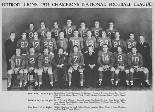 On Friday, September 20, 1935, the Lions opened their season with a 35–0 victory over the Philadelphia Eagles before a crowd of approximately 10,000 at University of Detroit Stadium. Halfback Ernie Caddel scored three touchdowns. Dutch Clark also scored a touchdown, and a fifth came on a 10-yard pass from Pug Vaughan to Frank Christensen. Clark kicked four extra points, and Glenn Presnell kicked the fifth.[1] The Lions prevented the Eagles from making a first down.[2] The Lions totaled 381 total yards against the Eagles, including 324 rushing yards on 57 carries for an average of 6.8 yards per carry.[3] Following the game, the Associated Press reported that the Lions has "definitely established themselves as serious contenders for the 1935 National Professional football league championship."[2]