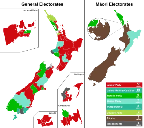 Apart from Labour and the coalition, the only two groups to win places in Parliament were the Country Party and the Ratana movement, both of which won two seats.