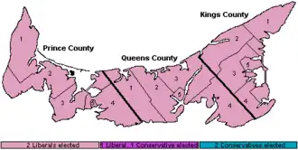 ![]() Map of PEI's ridings coloured in based on how they voted | |||||||||||||||||||||||||||||||||||||