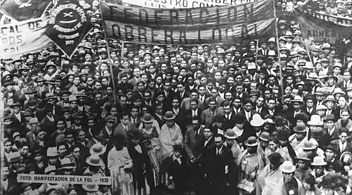 Among the biggest concerns for the government was the return of organized labor.[3] The labor movement was bolstered by discontent with the spiralling economy and the return of union organizers, soon surpassing their 1932 peak of influence. Beginning in 1935, workers strikes were organized, led by the two major labor unions, the Federation of Workers of Labor (FOT) and the Local Workers Federation (FOL). In response to rising prices in November, the FOT made a call for 100% wage increases for workers and a reduction in rental prices and consumer goods.[4] This set in motion a chain of strikes across the country sending it into crisis.[4]