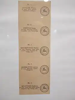 - ^ Kamuntavičius, Rūstis; Vaida Kamuntavičienė; Remigijus Civinskas; Kastytis Antanaitis (2001). Lietuvos istorija 11–12 klasėms (in Lithuanian). Vilnius: Vaga. pp. 385–386. ISBN 5-415-01502-7.