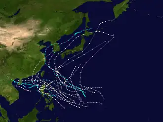 On August 6, a depression formed northeast of Yap, which proceeded west-northwesterly. The system intensified into a typhoon as it passed east of the Philippines. On August 12, the typhoon moved through the Batanes islands, with a pressure of 995 mbar (29.34 inHg) reported at Basco. Turning westward, the storm moved across the South China Sea, crossing China's Hainan island into the Gulf of Tonkin on August 14. It soon moved ashore and dissipated.[13][14]