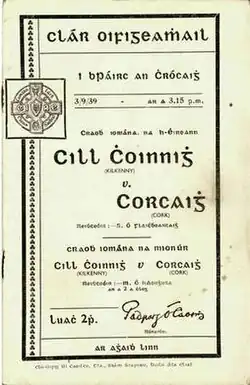 The 1939 All-Ireland Senior Hurling Championship Final, also known as the Thunder and Lightning Final, was the 52nd All-Ireland Final and the culmination of the 1939 All-Ireland Senior Hurling Championship, an inter-county hurling tournament for the top teams in Ireland. The match was held at Croke Park, Dublin, on 3 September 1939, between Kilkenny and Cork. The Munster champions narrowly lost to their Leinster opponents on a score line of 2–7 to 3-3.