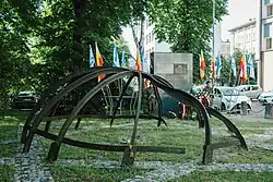 After the war, the ruins of the Great Synagogue were demolished. The victims burned alive by the Germans on June 27, 1941, were initially commemorated by a small obelisk. On August 16, 1995, in the place where the Great Synagogue was located, in the area between Suraska Street and Legionowa Street, a new, more impressive monument was unveiled. It was funded by the Białystok Jewish diaspora and the Białystok municipal authorities. The primary feature consists of an iron skeleton symbolizing the synagogue's dome. The skeleton was placed on the Star of David, which was made of granite cubes. Nearby, there is a wall-shaped monument topped with a bronze menorah. Two brass plaques were hung on its front wall. One shows the building of the Great Synagogue, the other has an inscription in Polish, English and Hebrew:[78]