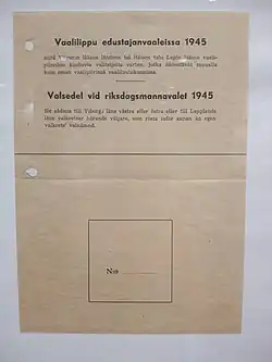 The communists could, for the first time since 1929, freely present their candidates. Through the Finnish People's Democratic League (SKDL), they were able to win over a large section of Social Democratic voters. The Patriotic People's Movement (IKL) had been banned by the time of the election. Prime Minister Paasikivi urged in February 1945 Finnish voters to elect "new faces" to Parliament, which they certainly did: almost half of the 200 deputies were new. Some wartime deputies, including Social DemocratVäinö Tanner and AgrarianViljami Kalliokoski, decided voluntarily not to seek re-election, because under the new political climate (Finland's desire to establish friendly relations with the Soviet Union), their wartime political activities, including their association with the informal Finnish-German military alliance, looked suspicious. The right-wing and centrist parties had to campaign carefully, so as not to appear anti-Soviet, while the Communists could loudly and vigorously accuse the right-wing and centrist parties of accepting their ban from open political activity, which had lasted from 1930 to 1944. One major economic issue in these elections was the continued scarcity of goods caused by the wartime rationing. Communists promised the impoverished voters a quick improvement in their living standards, and also other major parties promised more prosperity in the starting peacetime. These promises were made despite the still limited Finnish foreign trade - World War II would only end in Europe in May and in Asia in September - and the heavy burden which the Soviet Union's war reparations payments imposed on the Finnish economy.[1][2][3]
