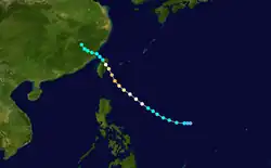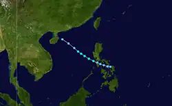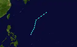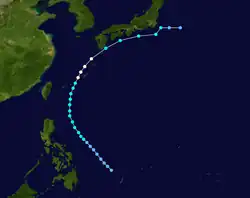 On 30 September the storm was located between the Philippines and Okinawa with winds between 210 and 260 kilometres per hour (130 and 160 mph) and waves up to 30 metres (100 ft).[11] On October 1, a United States Air Force PB4Y-2 aircraft went down during a flight into the typhoon, killing all seven crew members aboard.[12]