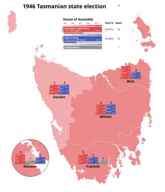 The 1946 Tasmanian state election was held on 23 November 1946 in the Australian state of Tasmania to elect 30 members of the Tasmanian House of Assembly. The election used the Hare-Clark proportional representation system[1] — six members were elected from each of five electorates.