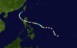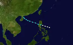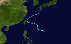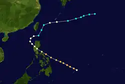 After passing Manila, the storm emerged from the coast of Zambales towards the South China Sea, starting to shift more towards the northwest and eventually north and northeast, all the way moving parallel to the coast of Luzon. The typhoon weakened into a tropical storm and recurved west of the Batanes group of islands and passed through the Bashi Channel south of Taiwan and continued north-eastward towards Miyakojima and the southern Japanese islands and eventually dissipated on 29 December. No data is available on what happened to the system after turning post-tropical.
