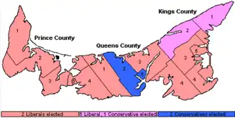 ![]() Map of PEI's ridings coloured in based on how they voted | |||||||||||||||||||||||||||||||||||||