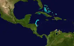 The final storm developed from a persistent low pressure area in the northwestern Caribbean Sea near Swan Island on November 3. A reconnaissance aircraft reported a well-defined eye feature as the storm reached its peak intensity. The storm drifted south-southwestward and began weakening on November 4. Later that day, it made landfall over northeastern Honduras as a tropical depression. Shortly after moving inland, the system dissipated.[8][6]