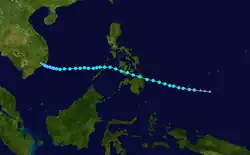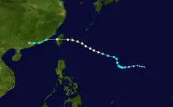 Elaine developed from an ill-defined easterly wave that passed south of Guam. Lack of sufficient data prevented accurate detection of the easterly wave east from Guam. As Elaine passed Yap, a surge of the monsoon winds to the south of the Inter-tropical trough intensified the wave and a weak circulation developed. The tropical storm moved at 12 knots until it passed over the northern tip of Mindanao; from this point a gradual recurvature toward the northwest was taken. A southerly flow in the South China Sea aided the intensification. The storm tracked within 60 miles of Manila and dissipated rapidly as it entered the China coast west-southwest of Hong Kong.[7]
