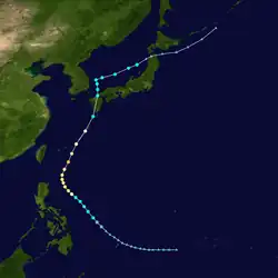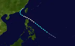 Gloria, one of the most intense and destructive typhoons of the 1949 season, formed from a vortex associated with an easterly wave which was intensified by a southwesterly monsoon surge after passing south or Guam. Gloria was first detected as a typhoon near 15 N. and 132 E. Her future track was north for 450 miles with curvature to the northwest passing over Okinawa and entering the China coast near Shanghai. Maximum winds were estimated in excess of 110 knots.[7] Gloria was the strongest typhoon to make landfall in the Shanghai area until Typhoon Bebinca 75 years later.[8][9]