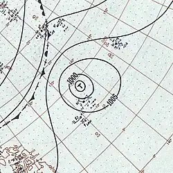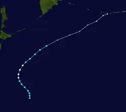 Faye was one of two storms that had its origin in the upper air, between 25 and 40 thousand feet, and gradually descended to the surface over the western edge of the Pacific high cell(indications of Kwajalein's upper winds verified the presence of an upper air low, and five days later its nearness to Iwo Jima was reflected on the surface) Faye, a moderate storm moved near and to the south of Iwo Jima and recurved around the Pacific high cell, 500 miles to the west of Iwo Jima. Faye followed a northerly path and passed over the western edge of Kyushu into the Japanese Sea.[7]