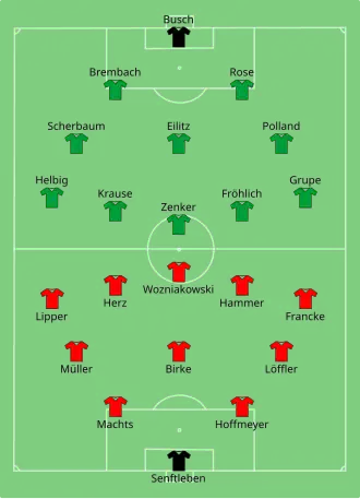 While Chemie Leipzig were able to compete with their starting players, Turbine Erfurt were without defender Helmut Nordhaus and center-forward Wolfgang Nitsche, two important players. Both were suspended due to being disciplined in the international match between East Germany and Poland. Erfurt had another loss to cope with, as twelve minutes into the game, striker Heinz Hammer had to be substituted out due to an injury. Prior to that, Leipzig's attacker Georg Zenker had proven the dangerousness of his team with a good opportunity. At first the game was open, and Erfurt had an opportunity to take the lead in the 25th minute. However, Heinz Wozniakowski's free kick hit the post. Erfurt were thankful for the weak performance of the left attack side of Leipzig of Heinz Fröhlich and Rolf Grupe, and the absence of Nordhaus remained unnoticed for the time being.
