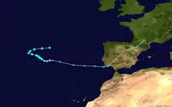 The system moved west-southwestward, atypical for cyclones in that region during September. On September 9, the storm turned to the southeast, reaching estimated peak winds of 50 mph (80 km/h), based on ship observations. Moving slowly through the northern Azores, the storm produced winds of 35 mph (56 km/h) along Terceira Island. It slowly weakened, and by late on September 10 the system degraded into a tropical depression. By the next day, the system was interacting with an approaching cold front, indicating that the depression had transitioned into an extratropical cyclone. Around 20:00 UTC, the storm moved ashore the southwestern tip of Portugal with gale-force winds. The storm turned to the northeast through the Iberian Peninsula, dissipating on September 14 over southwestern France.[12]