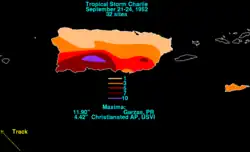 On September 22, a tropical wave moved into the eastern Caribbean Sea,[1] spawning a tropical depression near Hispaniola early on September 24.[4] As it tracked west-northwestward, the low dropped heavy rainfall, peaking at 4.42 in (112 mm) in Christiansted, United States Virgin Islands, as well as 11.9 in (300 mm) in Garzas, Puerto Rico.[15] In Puerto Rico, the rains caused landslides that affected seven towns, notably Ponce, the island's second-largest city.[16] There, at least 14 buildings were destroyed.[17] The floods left more than 1,000 people homeless, 300 of whom took refuge in a Red Cross shelter.[16] Overall, the flooding on the island killed four people and left moderate damage of around $1 million (1952 USD, $11.8 million 2025 USD).[1]