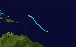 The third tropical cyclone of the season developed on August 31 a short distance east of the northern Lesser Antilles.[4] Its presence was reported by a ship the next day that encountered rough seas and gale-force winds. As a result, the Weather Bureau sent the Hurricane Hunters to investigate the system, which reported a strengthening hurricane moving northwestward.[1] Given the name Baker, the hurricane passed north of the Lesser Antilles, reaching peak winds of 110 mph (175 km/h) late on September 3.[4] For several days, the Hurricane Hunters reported similar winds, along with gusts up to 140 mph (230 km/h).[1]