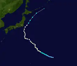On July 23, Lola spawned southeast of Japan. The typhoon curved northwest before differing between north and west. The storm then drifted north before curving northeast and dissipating shortly after on August 3.[9]