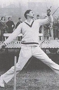 He let me have a very fast, short-pitched delivery...Instinctively I turned a defensive back on the ball which skidded through and hit me a sickening blow on the back of my head. I sank to the ground and as I slipped in and out of consciousness, I was dimly aware of the players gathering round my prostrate body. Indistinctly I heard my fellow batsman Bill Edrich saying: 'My God, Lindy, you've killed him!'...I was very, very angry with Ray Lindwall. And the whole of the Aussie team knew it...I would return the bouncer with interest!.[6] Picture