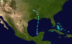 A westward-moving tropical wave traversed the Lesser Antilles on July 20. It moved across the Caribbean, and its thunderstorms increased on July 23 while passing south of Cuba and beneath a high-pressure area. There is evidence that it could have developed a circulation on July 24 before it struck the Yucatán Peninsula. It is confirmed to have developed into a tropical depression on July 25 in the Bay of Campeche. As it continued west-northwestward, it rapidly intensified into Tropical Storm Anna, and before moving ashore in Mexico near Ozuluama, Veracruz, on July 26 it attained hurricane status. Peak winds reached 85 mph (135 km/h), although Anna rapidly dissipated on July 27 as it moved further inland.[9] The high winds wrecked several homes in poor regions of Tampico, Tamaulipas, while rainfall of 2.5 in (64 mm) resulted in flooding.[5] The high winds severed telegraph lines from Tampico to San Luis Potosí. The same area was affected by several hurricanes in the previous year.[12] Damage totaled around $50,000, and there were no deaths.[5]