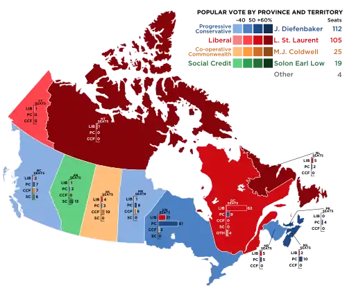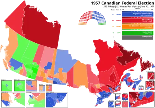 At the start of 1956, the Tories were led by former Ontario premier George A. Drew, who had been elected PC leader in 1948 over Saskatchewan MP John Diefenbaker.[11] Drew was the fifth man to lead the Tories in their 21 years out of power.[12] None had come close to defeating the Liberals; the best performance was in 1945, when John Bracken secured 67 seats for the Tories. The Liberals, though, had won 125 seats, and maintained their majority.[13] In the 1953 election, the PC party won 51 seats out of the 265 in the House of Commons.[14] Subsequently, the Tories picked up two seats from the Liberals in by-elections, and the Liberals (who had won 169 seats in 1953) lost an additional seat to the Co-operative Commonwealth Federation (CCF, the predecessor of the New Democratic Party (NDP)).[15]