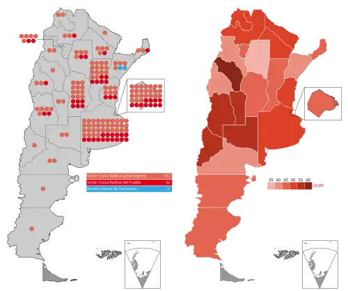 | Intransigent Radical Civic Union (UCRI) | 4,070,398 | 49.33 | 66 | 67 | 133 | |