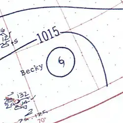 - ^ Preliminary Report on Tropical Storm Becky August 11–15, 1958 (GIF) (Report). United States Weather Bureau. 1958-08-18. Retrieved 2013-03-06.