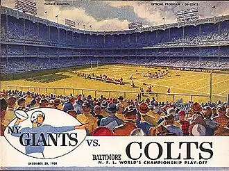 The 1958 NFL Championship Game was the 26th NFL championship game, played on December 28 at Yankee Stadium in New York City. It was the first NFL game to be decided in sudden death overtime.[9] The Baltimore Colts defeated the New York Giants 23–17 in what soon became widely known as "the Greatest Game Ever Played".[16] Its legendary status in the pantheon of historic NFL games was again confirmed by a nationwide poll of 66 media members in 2019, who voted it the best game in the league's first 100 years.[17][18]