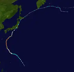 Typhoon Helen, which formed on September 9, rapidly intensified to a 175-mile-per-hour (282 km/h) super typhoon on the 14th. It moved to the northeast, and steadily weakened until hitting southeastern Japan as a 105-mile-per-hour (169 km/h) typhoon on the 17th. It paralleled the Japanese coastline, and after turning northward it became extratropical on the 19th in the Sea of Okhotsk.[5] Helen's effects caused 24 fatalities (with 44 missing) and 108 injuries.[6]