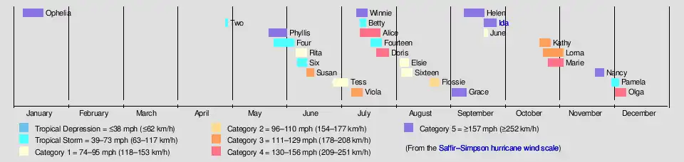 The 1958 Pacific typhoon season was an event in the annual cycle of tropical cyclone formation. The season had no official bounds, but tropical cyclones in the Western Pacific Ocean normally develop between May and October. The season was below average in storms, with only twenty-three forming. However, all but two of those storms developed into typhoons, resulting in a well above-average number of typhoons, and a very high ACE figure of 445.8 units. In addition, there were also nine tropical storms tracked only by the JMA. The season began very early, with a very rare super typhoon in January, Typhoon Ophelia, and ended in early December with Typhoon Olga. It also featured Typhoon Ida, the strongest storm ever recorded at that time.