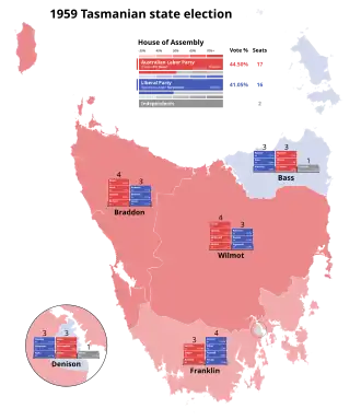The Labor Party won the most seats in the newly expanded House of Assembly, but not enough to govern in a majority as two seats were won by Independents. The 1959 election was the last occasion in which an ungrouped independent (Bill Wedd) won a seat in Tasmania.[3]