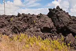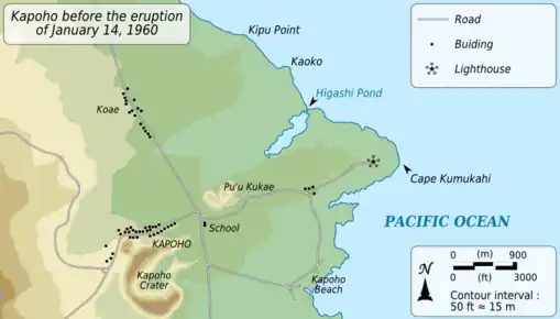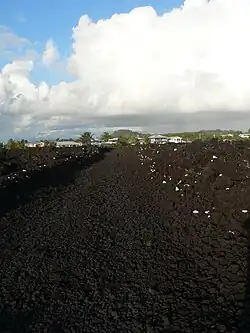 A community of 300 inhabitants, a school, churches, roads, and crops were destroyed and covered by several meters of lava that advanced out to sea, modifying the coastline by bringing Cape Kumukahi, Hawaii's easternmost point, a little further east.[6] After the lava had cooled, Kapoho was not rebuilt, except a few buildings southwest of the site of the former settlement, next to the lava flow.[8] The roads have been retraced, with the coastal road crossing the lava flow from one end to the other and the road to the Cape Kumukahi lighthouse via Kapoho following the old route.[8] Part of the lava flow, notably the mass of tephra formed on January 27, has since been exploited as a slag quarry not far from Koaʻe.[8]