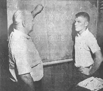 Head coach Jim Freeman diagrams a play for quarterback Phil Sullivan, 1961