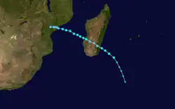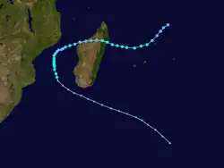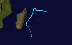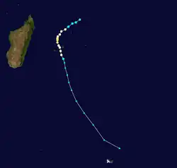 Danielle existed from January 15 to January 23. On January 20, Danielle crossed between Réunion and Mauritius, producing wind gusts of 219 km/h (136 mph) in the latter island. Over three days, the storm dropped heavy rainfall, reaching 795 mm (31.3 in).[1][2]