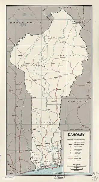 The West African colony of French Dahomey, the present-day nation of Benin, was largely ignored by the French during its colonial era in French West Africa.[1] Dahomey had a weak economy due to a lack of known natural resources. The last time the colony had a favorable trade balance was in 1924.[2] Its main export was intellectuals, and was known as the Latin Quarter of Africa due to its rich cultural landscape.[3] On August 1, 1960, Dahomey gained its independence and prominent politician Hubert Maga was chosen as its first president.[4] At the time, Dahomey was also facing a major economic recession and after independence, France stopped subsidies. Maga helped counter this by investing in infrastructure and encouraging civil servants to take Dahomey as their residence. Still, Dahomey's GDP grew by 1.4 percent annually from 1957 to 1965, making Dahomey's economy one of the weakest in Africa.[2]