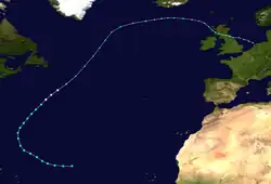 By late on September 12, the storm curved northeastward and passed to the northeast of Bermuda early the next day,[3] bringing 4.05 in (103 mm) of precipitation and wind gusts up to 70 mph (110 km/h).[29][30] Throughout the island, low-lying areas were flooded and trees were felled. At St. George's Island, residents were briefly left without electricity and telephones and the causeway linking St. George's Island to the main island was inundated.[31] Early on September 13, Ethel intensified into a Category 2 hurricane and soon peaked with winds of 105 mph (169 km/h). The system became extratropical late on September 14, while located about 255 mi (410 km) southeast of Cape Race. Newfoundland. The extratropical remnants slowly weakened while meandering around the Atlantic, until dissipating just north of the Azores on September 17.[3]